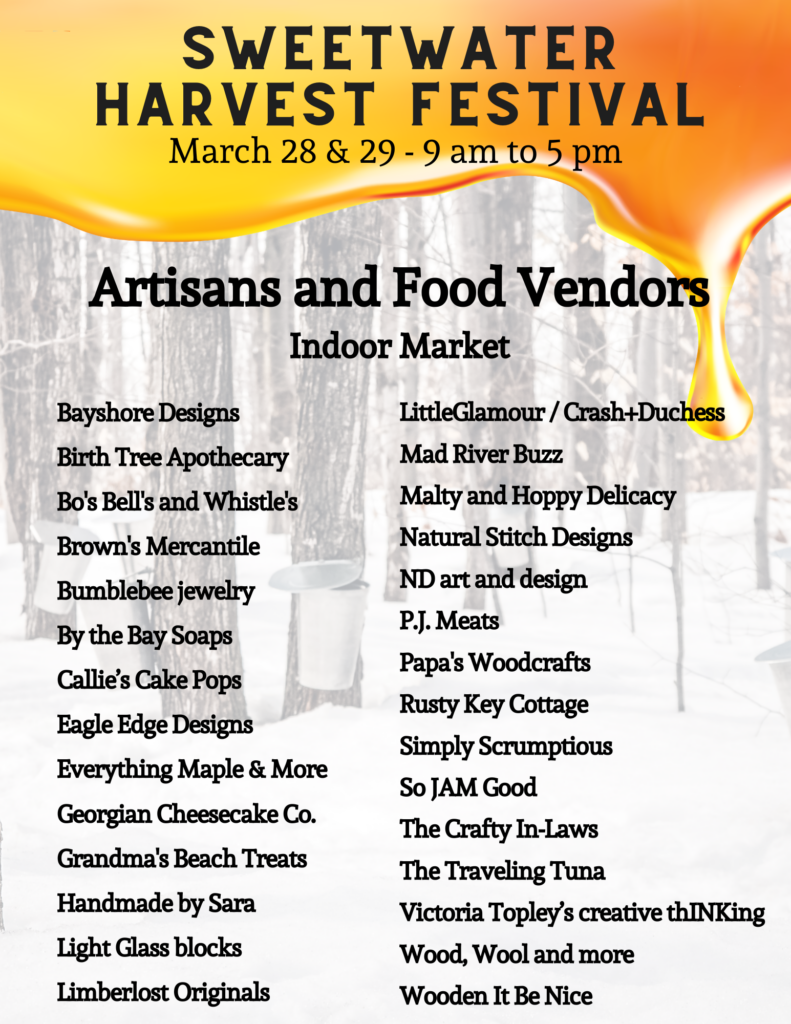 - Enjoy the “Taste of Sweetwater” by visiting vendors serving unique maple-inspired food and treats including: